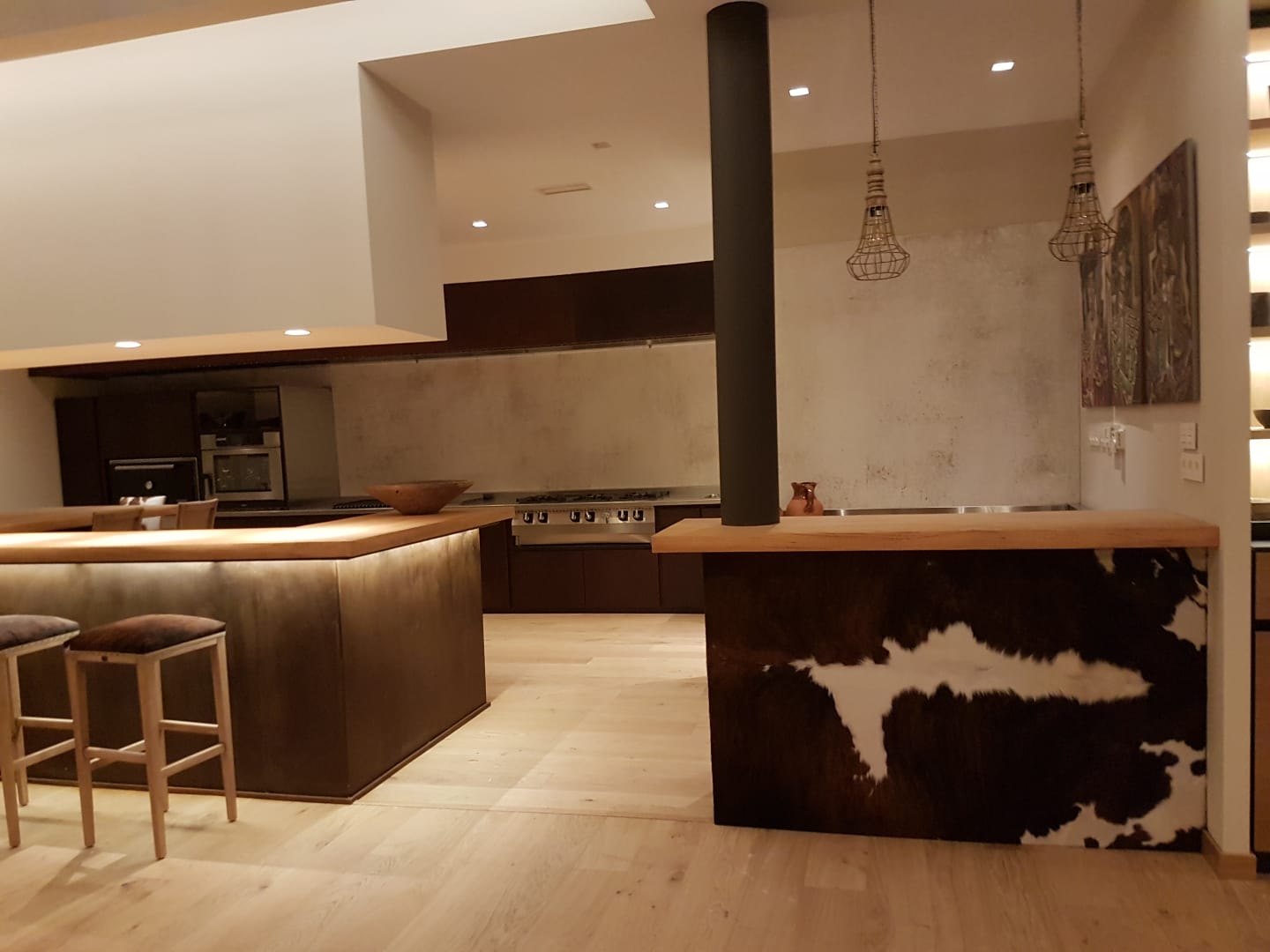 El resultado es una cocina espectacular, abierta y elegante, donde la madera natural, los acabados oscuros y la iluminación cálida crean una atmósfera sofisticada y acogedora.