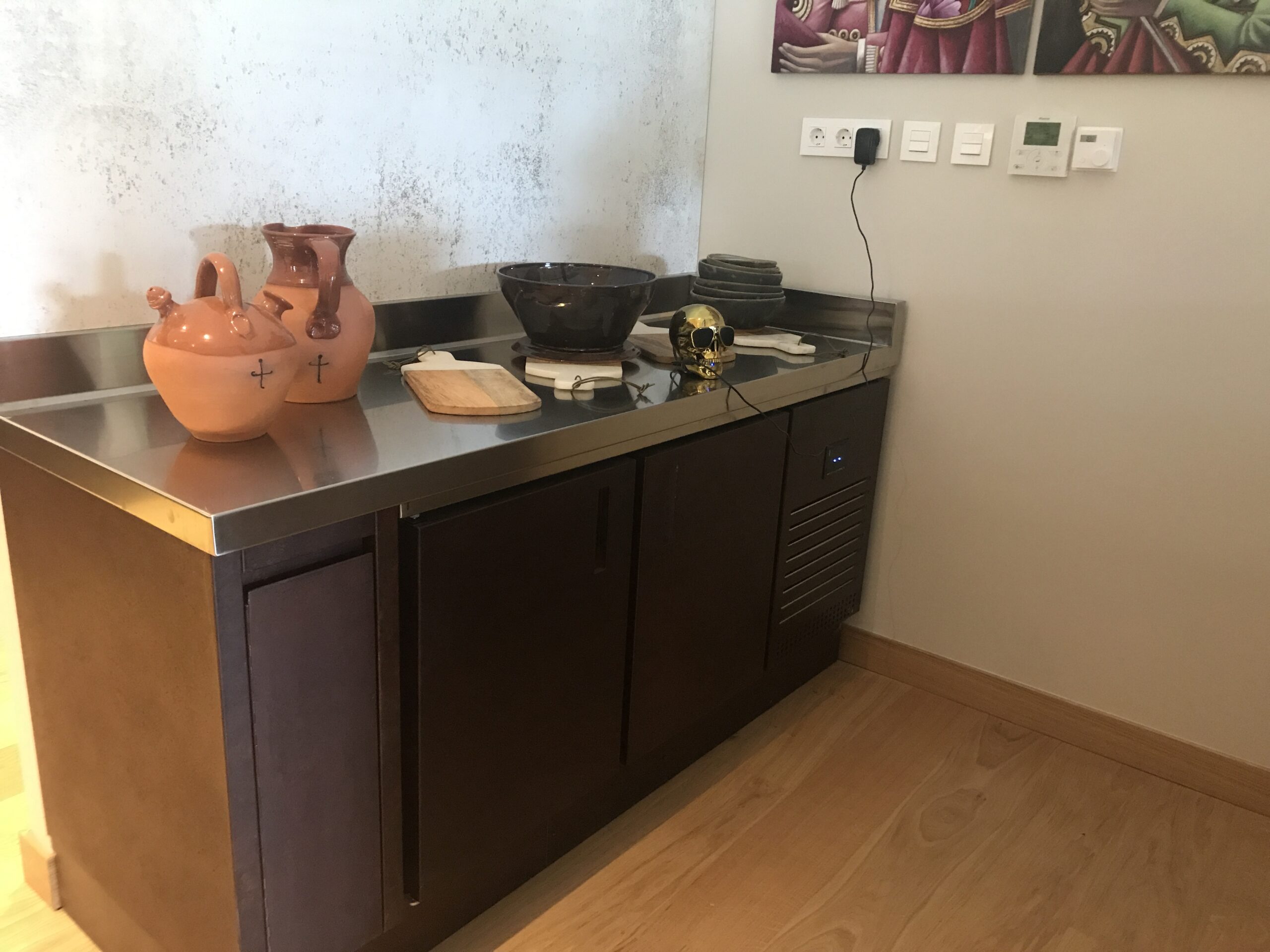 - Mobiliario técnico en acero inoxidable, combinado con frentes personalizados en acabado oscuro.