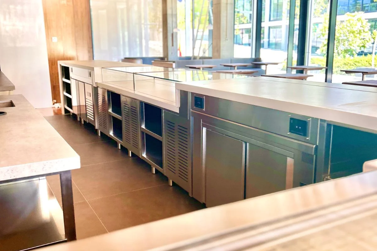 Las fotografías muestran una barra de líneas rectas y acabados en acero inoxidable y superficies laminadas, combinando durabilidad, higiene y elegancia. El conjunto se complementa con vitrinas refrigeradas, módulos calientes y zonas de autoservicio, que permiten ofrecer alimentos a la temperatura ideal y mantener una presentación impecable durante todo el servicio.